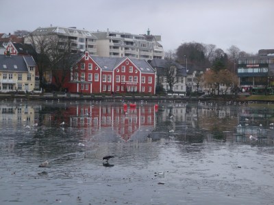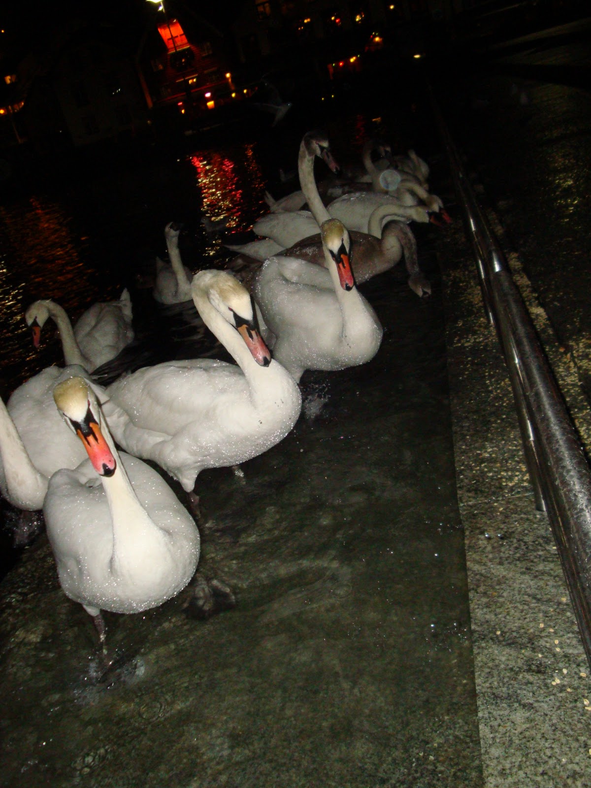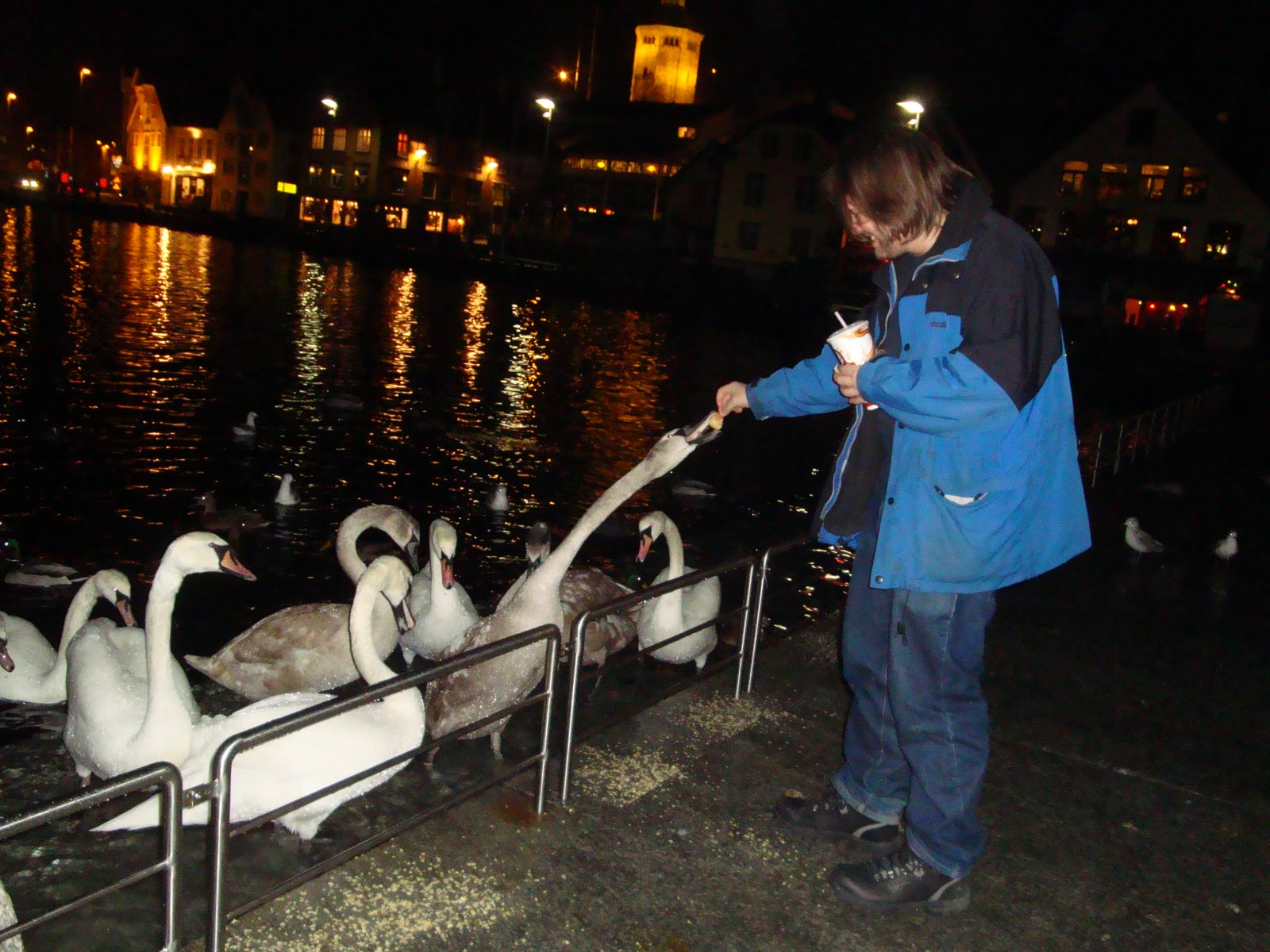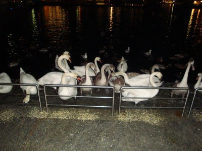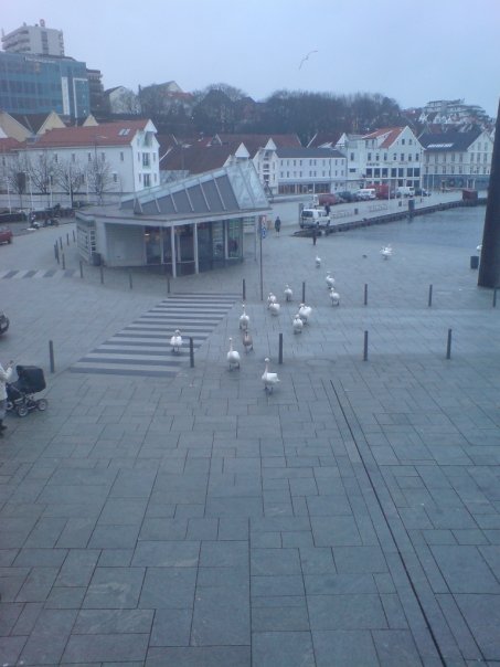 I wonder if these swans are the same as these swans in 2009. For your information, these creatures have been a problem in the Stavanger sentrum. They stopped the traffic a lot of times. So that is the reason why people built the fence along the bay.